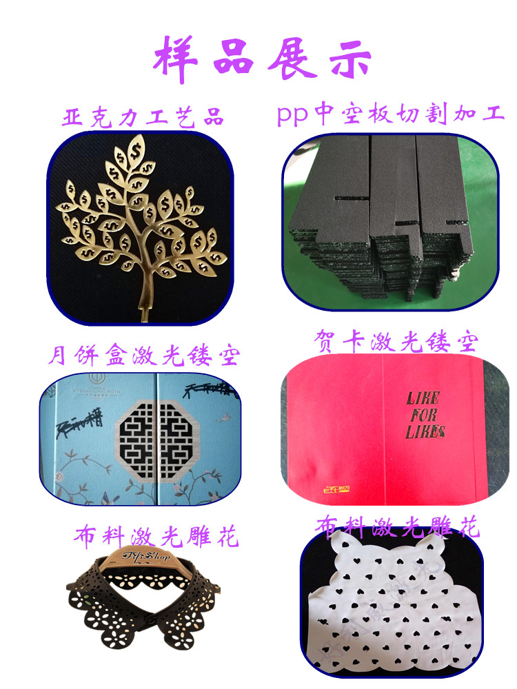 本公司專(zhuān)業(yè)對(duì)外加工布料切割加工、無(wú)紡布毛氈激光鏤空 皮革激光加工、服裝布料激光雕花、麂皮絨激光切割、亞克力,竹木盒月餅盒激光加工,皮革激光雕花等。激光沖孔切割不發(fā)黑不發(fā)黃不發(fā)臭無(wú)黑灰”受到眾多客戶(hù)認(rèn)可歡迎打樣咨詢(xún)。